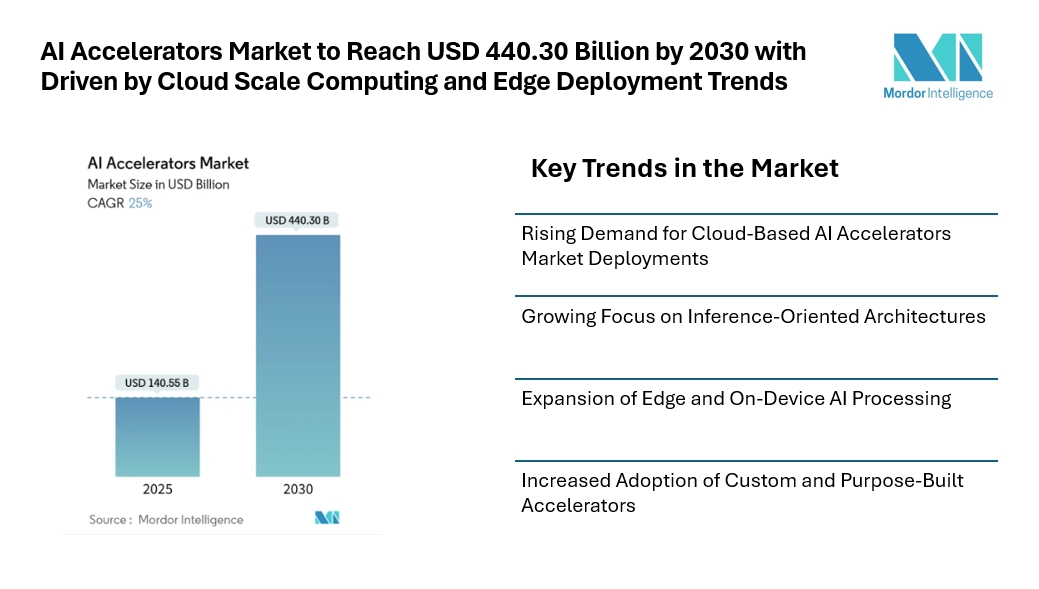 The AI Accelerators Market continues to expand at a rapid pace as enterprises, cloud service providers, and industry-specific users increase investments in high-performance computing solutions. According to Mordor Intelligence, the AI Accelerators Market size was valued at USD 140.55 billion in 2024 and is projected to reach USD 440.30 billion by 2030. This growth reflects increasing adoption of artificial intelligence workloads across cloud data centers, automotive systems, healthcare platforms, and enterprise infrastructure.