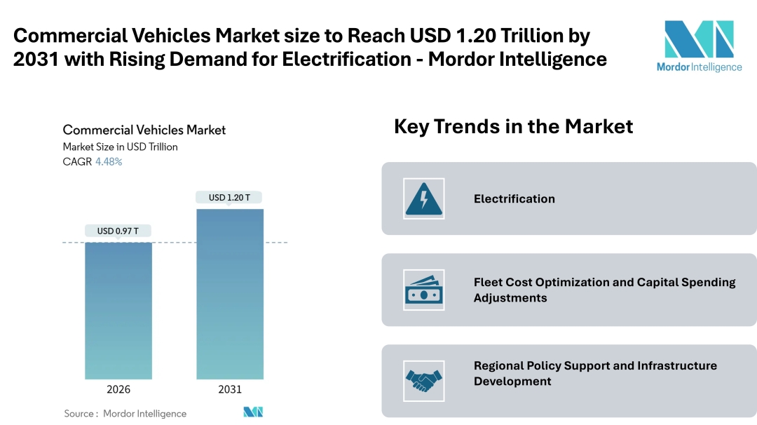 According to Mordor Intelligence, the commercial vehicles market size was valued at USD 0.97 trillion in 2026 and is expected to reach USD 1.20 trillion by 2031, registering a CAGR of 4.48% during the market forecast period.
