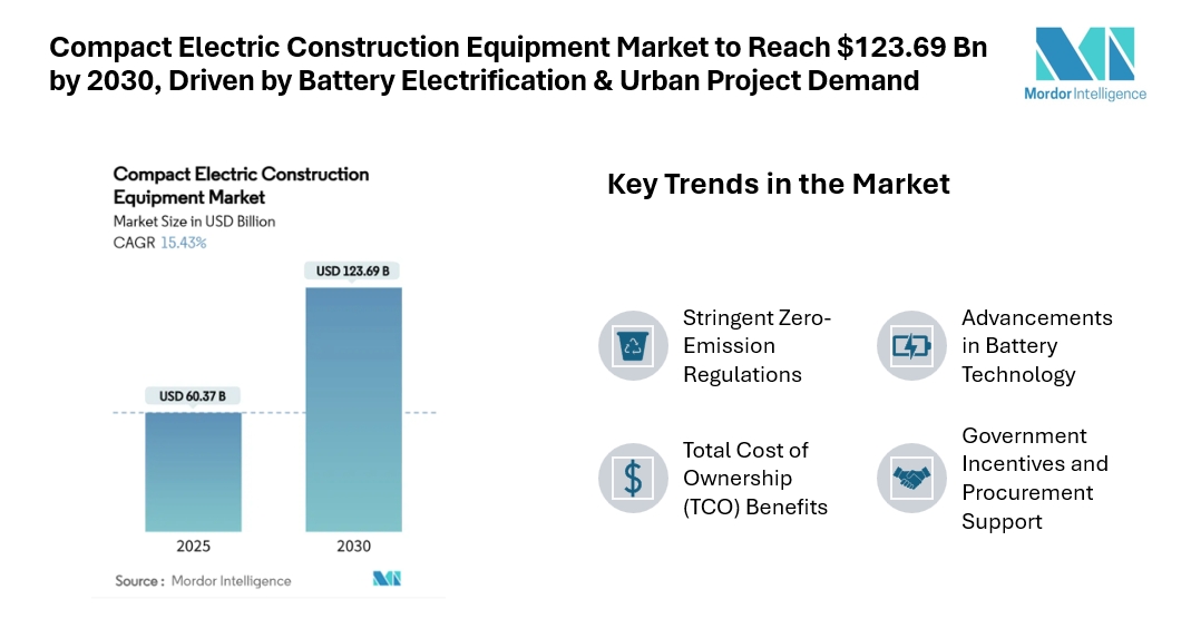 The global compact electric construction equipment market is experiencing rapid growth as construction operators shift from diesel-powered machinery to electric alternatives. Valued at USD 60.37 billion in 2025, the market is projected to reach USD 123.69 billion by 2030, registering a robust CAGR of 15.43%. Rising demand is primarily driven by urban construction projects, renewable energy infrastructure, and government policies promoting zero-emission equipment.
