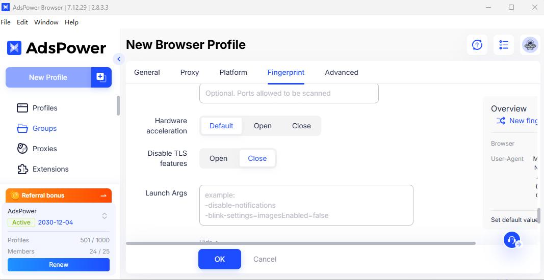 On the network side, AdsPower offers advanced fingerprint masking. It can disable WebRTC’s UDP traffic so that a real IP isn’t leaked. It also allows toggling specific TLS handshake features: administrators can enable a “Disable TLS features” switch and define which cipher suites the browser announces. By customizing TLS (JA3) fingerprints, AdsPower makes automated detection much harder. Multilogin’s interface does not expose such low-level network settings, meaning a profile’s TLS signature or WebRTC behavior could inadvertently expose its real environment. In practice, AdsPower’s ability to adjust dozens of underlying signals (WebGL metadata, Canvas noise, AudioContext, timezone, etc.) and match them to each claimed UA keeps profiles coherent. Multilogin relies more on broad spoofing of canvas/WebGL without giving users these toggles, so it’s less foolproof against state-of-the-art fingerprinting.