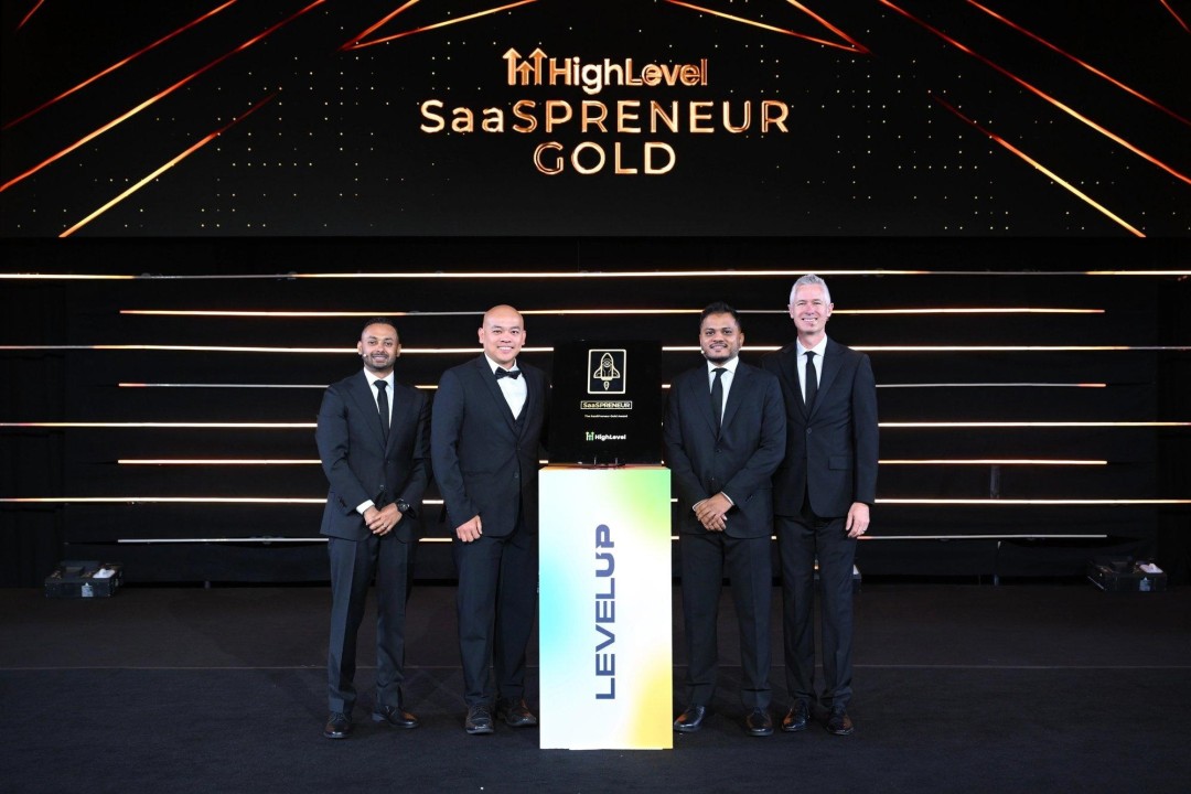 Lucas Goh receiving the GoHighLevel SaaSPRENEUR Gold Award at the LevelUp conference in Dallas, October 2025.